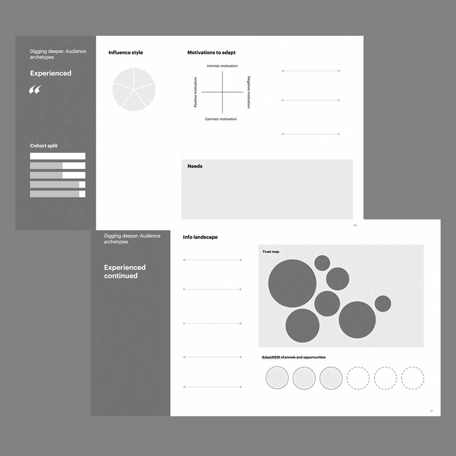 The project began with an alignment session and a review of NSW adaptation products. Stakeholder mapping and recruitment shaped the research plan, while workshops revealed key user motivations and barriers. These insights informed a review of national and NSW resources, including the AdaptNSW website, forum, and newsletter. We analysed data, gathered user feedback, ran IA tests, and reviewed content to shape a new value proposition, refined archetypes, and content and experience recommendations.